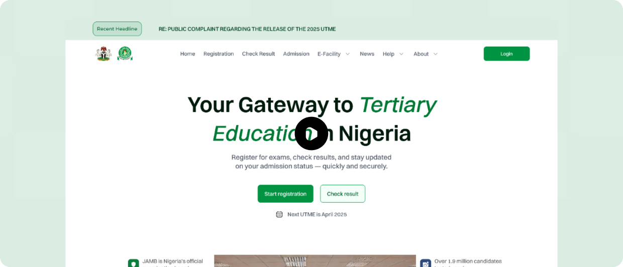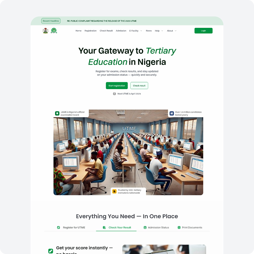 This is a personal redesign project focused on improving the user experience of the JAMB landing page. As a designer passionate about solving real problems, I wanted to create a more intuitive and accessible experience for students navigating one of Nigeria’s most important education platforms.
