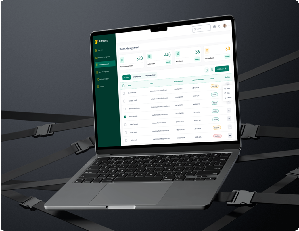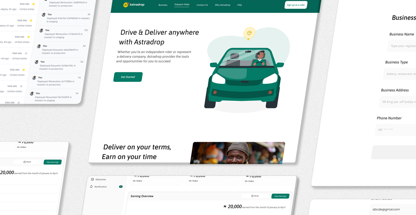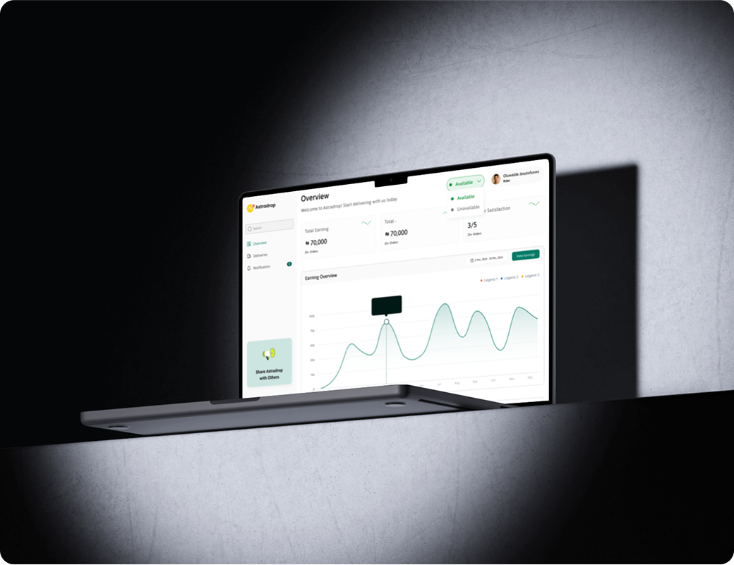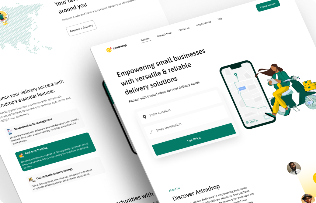 Astradrop is a logistics platform designed to simplify deliveries for businesses and customers. The platform connects users with riders, ensuring a fast, reliable, and seamless delivery experience. As the UI/UX Designer, I was responsible for designing the end-to-end experience across multiple touchpoints—including the landing page, business and rider apps, web app, and admin dashboard.